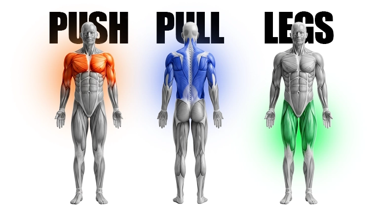 Es un programa que divide el entrenamiento en tres bloques: empuje (pecho, hombros, tríceps), tirón (espalda y bíceps) y piernas (cuádriceps, isquiotibiales y glúteos).
